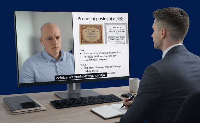 V štirih šolskih urah predavanja imate možnost, da popolnoma brezplačno pridobite znanje iz gospodarskega prava za pravniški državni izpit — tokrat v obliki posnetka, ki si ga lahko ogledate kadarkoli in v svojem tempu.